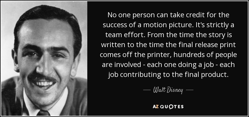 No one person can take credit for the success of a motion picture. It's strictly a team effort. From the time the story is written to the time the final release print comes off the printer, hundreds of people are involved - each one doing a job - each job contributing to the final product.