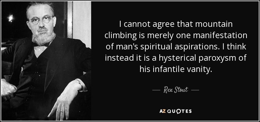 I cannot agree that mountain climbing is merely one manifestation of man's spiritual aspirations. I think instead it is a hysterical paroxysm of his infantile vanity.