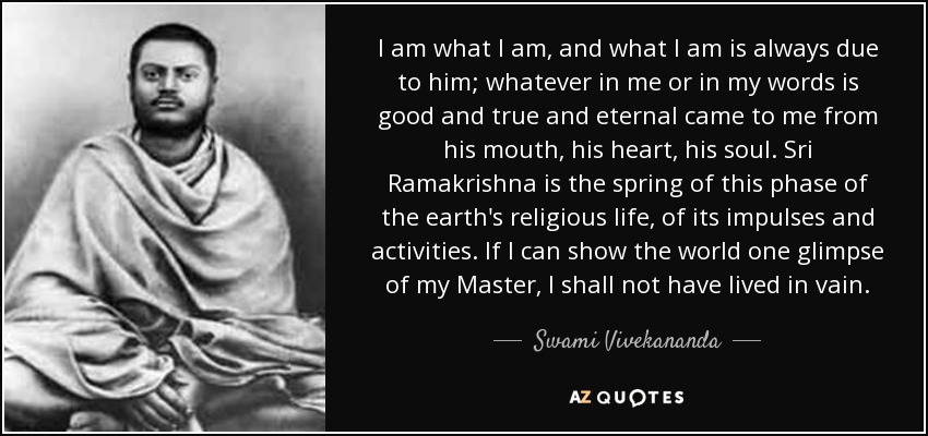 I am what I am, and what I am is always due to him; whatever in me or in my words is good and true and eternal came to me from his mouth, his heart, his soul. Sri Ramakrishna is the spring of this phase of the earth's religious life, of its impulses and activities. If I can show the world one glimpse of my Master, I shall not have lived in vain.