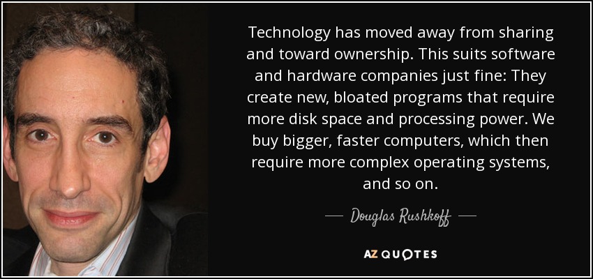 Technology has moved away from sharing and toward ownership. This suits software and hardware companies just fine: They create new, bloated programs that require more disk space and processing power. We buy bigger, faster computers, which then require more complex operating systems, and so on.