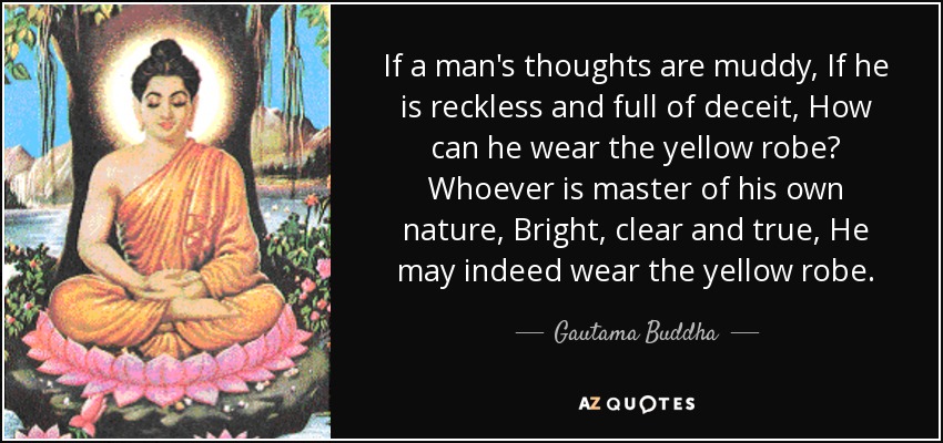 If a man's thoughts are muddy, If he is reckless and full of deceit, How can he wear the yellow robe? Whoever is master of his own nature, Bright, clear and true, He may indeed wear the yellow robe.