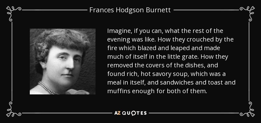 Imagine, if you can, what the rest of the evening was like. How they crouched by the fire which blazed and leaped and made much of itself in the little grate. How they removed the covers of the dishes, and found rich, hot savory soup, which was a meal in itself, and sandwiches and toast and muffins enough for both of them.