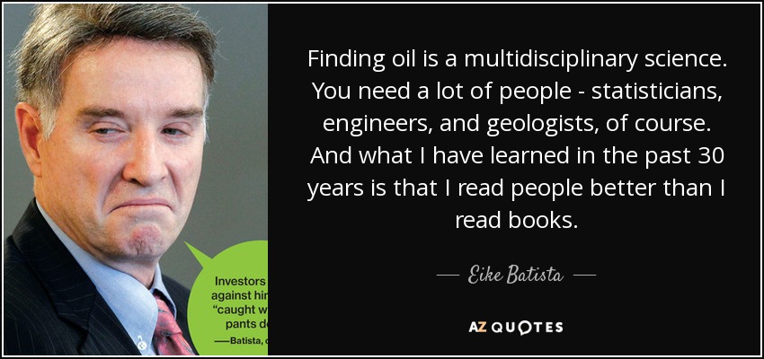 Finding oil is a multidisciplinary science. You need a lot of people - statisticians, engineers, and geologists, of course. And what I have learned in the past 30 years is that I read people better than I read books.
