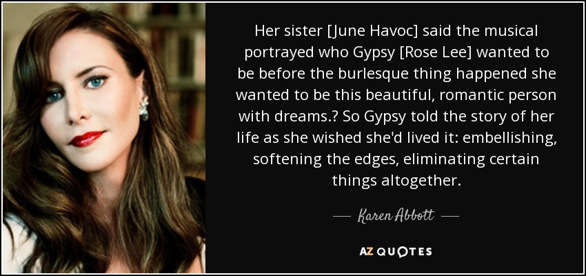 Her sister [June Havoc] said the musical portrayed who Gypsy [Rose Lee] wanted to be before the burlesque thing happened she wanted to be this beautiful, romantic person with dreams. So Gypsy told the story of her life as she wished she'd lived it: embellishing, softening the edges, eliminating certain things altogether.