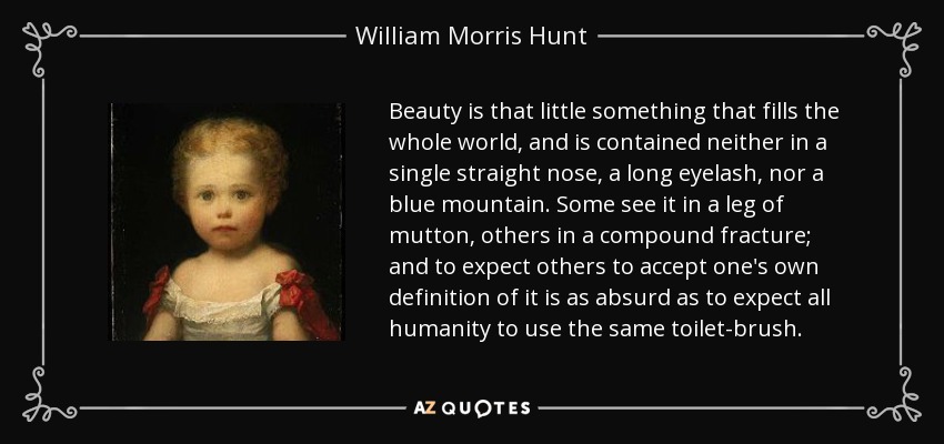 Beauty is that little something that fills the whole world, and is contained neither in a single straight nose, a long eyelash, nor a blue mountain. Some see it in a leg of mutton, others in a compound fracture; and to expect others to accept one's own definition of it is as absurd as to expect all humanity to use the same toilet-brush.