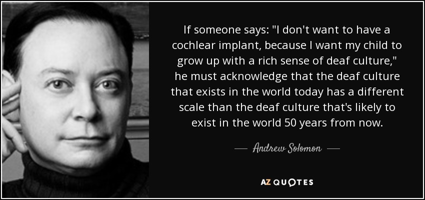 If someone says: "I don't want to have a cochlear implant, because I want my child to grow up with a rich sense of deaf culture," he must acknowledge that the deaf culture that exists in the world today has a different scale than the deaf culture that's likely to exist in the world 50 years from now.