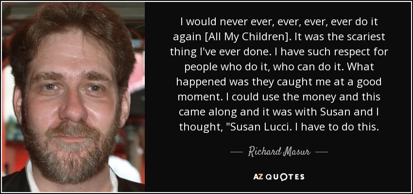 I would never ever, ever, ever, ever do it again [All My Children]. It was the scariest thing I've ever done. I have such respect for people who do it, who can do it. What happened was they caught me at a good moment. I could use the money and this came along and it was with Susan and I thought, "Susan Lucci. I have to do this.