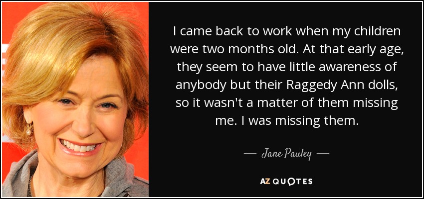 I came back to work when my children were two months old. At that early age, they seem to have little awareness of anybody but their Raggedy Ann dolls, so it wasn't a matter of them missing me. I was missing them.
