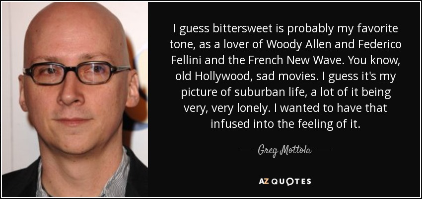 I guess bittersweet is probably my favorite tone, as a lover of Woody Allen and Federico Fellini and the French New Wave. You know, old Hollywood, sad movies. I guess it's my picture of suburban life, a lot of it being very, very lonely. I wanted to have that infused into the feeling of it.