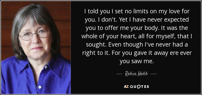 I told you I set no limits on my love for you. I don't. Yet I have never expected you to offer me your body. It was the whole of your heart, all for myself, that I sought. Even though I've never had a right to it. For you gave it away ere ever you saw me.