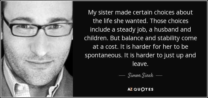 My sister made certain choices about the life she wanted. Those choices include a steady job, a husband and children. But balance and stability come at a cost. It is harder for her to be spontaneous. It is harder to just up and leave.