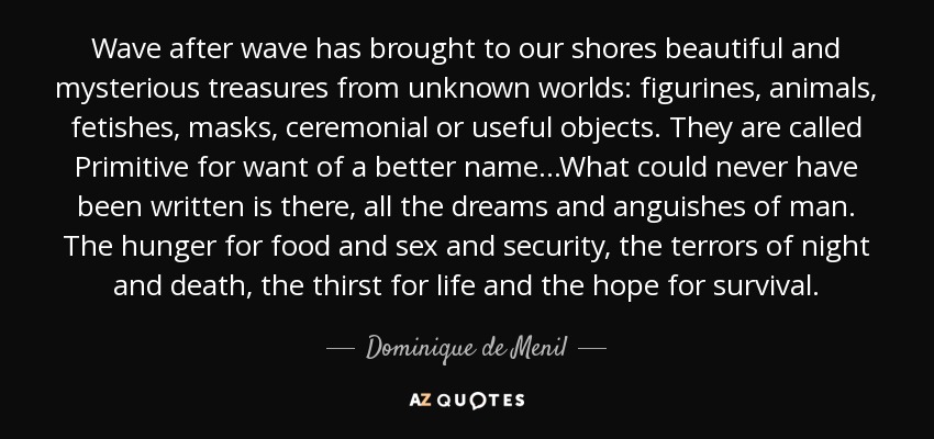 Wave after wave has brought to our shores beautiful and mysterious treasures from unknown worlds: figurines, animals, fetishes, masks, ceremonial or useful objects. They are called Primitive for want of a better name...What could never have been written is there, all the dreams and anguishes of man. The hunger for food and sex and security, the terrors of night and death, the thirst for life and the hope for survival.
