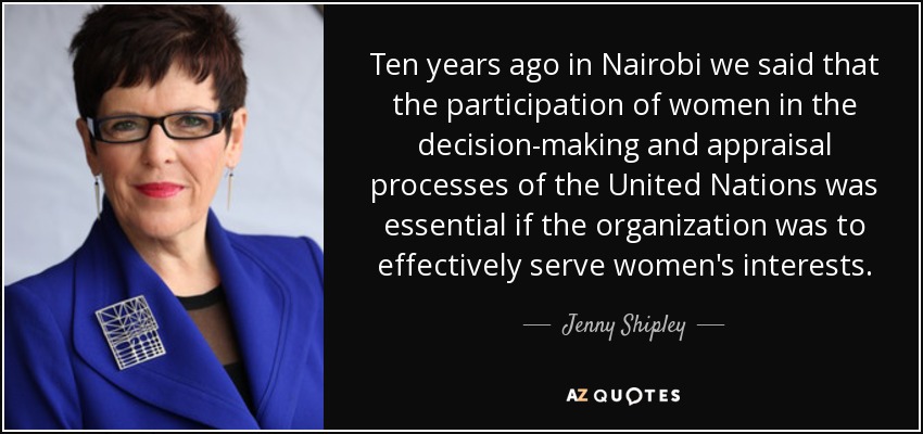 Ten years ago in Nairobi we said that the participation of women in the decision-making and appraisal processes of the United Nations was essential if the organization was to effectively serve women's interests.