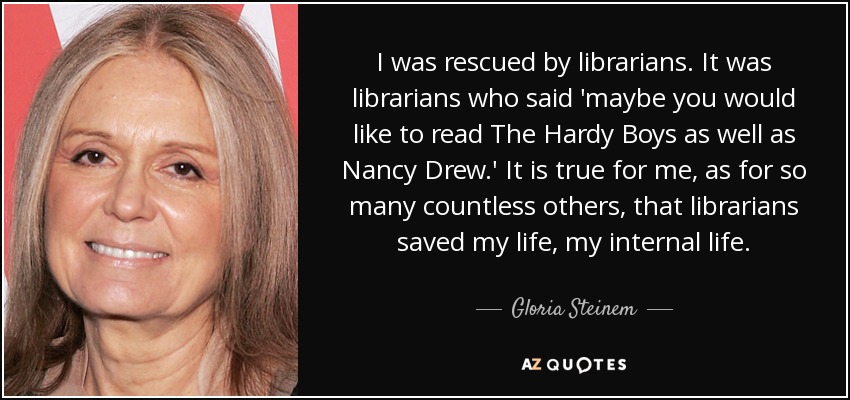 I was rescued by librarians. It was librarians who said 'maybe you would like to read The Hardy Boys as well as Nancy Drew.' It is true for me, as for so many countless others, that librarians saved my life, my internal life.
