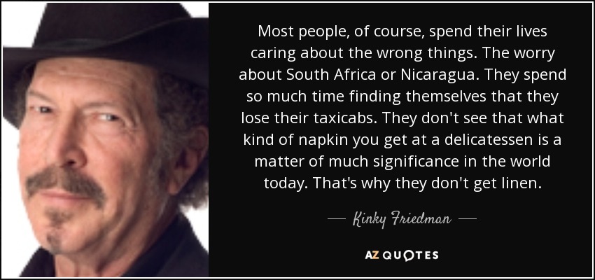 Most people, of course, spend their lives caring about the wrong things. The worry about South Africa or Nicaragua. They spend so much time finding themselves that they lose their taxicabs. They don't see that what kind of napkin you get at a delicatessen is a matter of much significance in the world today. That's why they don't get linen.