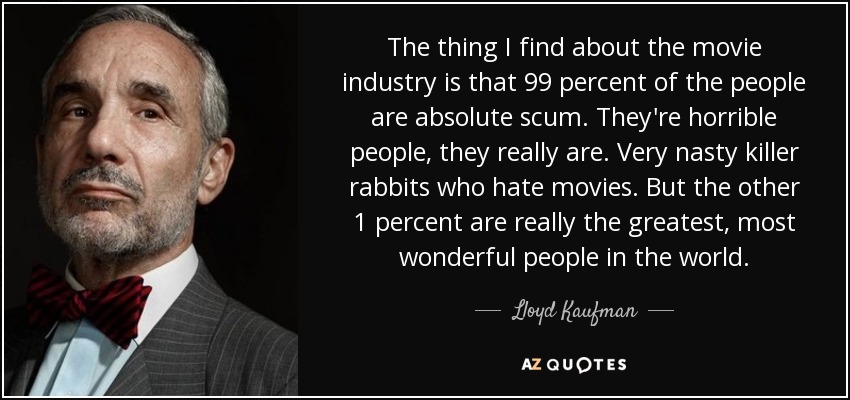 The thing I find about the movie industry is that 99 percent of the people are absolute scum. They're horrible people, they really are. Very nasty killer rabbits who hate movies. But the other 1 percent are really the greatest, most wonderful people in the world.