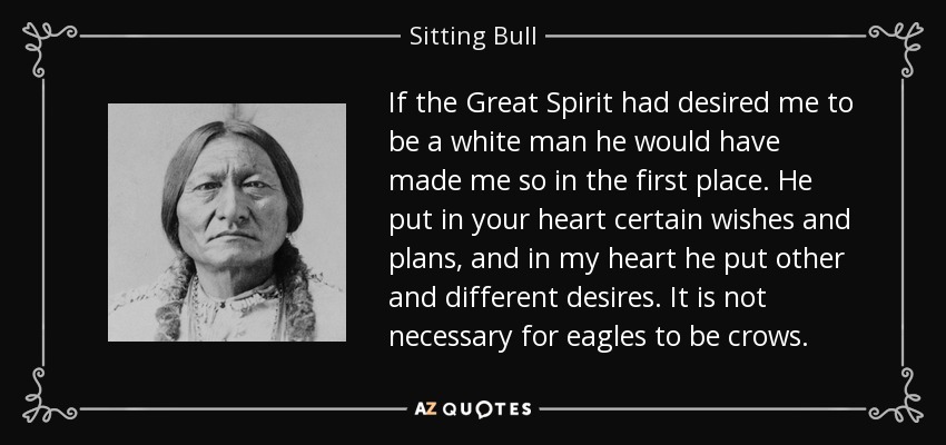 If the Great Spirit had desired me to be a white man he would have made me so in the first place. He put in your heart certain wishes and plans, and in my heart he put other and different desires. It is not necessary for eagles to be crows.