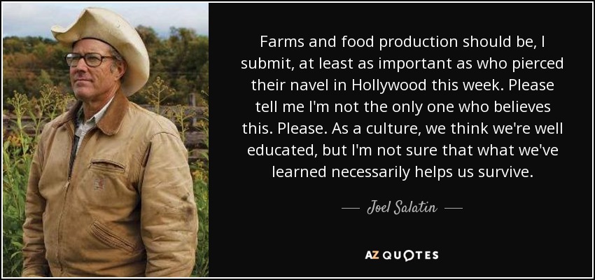Farms and food production should be, I submit, at least as important as who pierced their navel in Hollywood this week. Please tell me I'm not the only one who believes this. Please. As a culture, we think we're well educated, but I'm not sure that what we've learned necessarily helps us survive.
