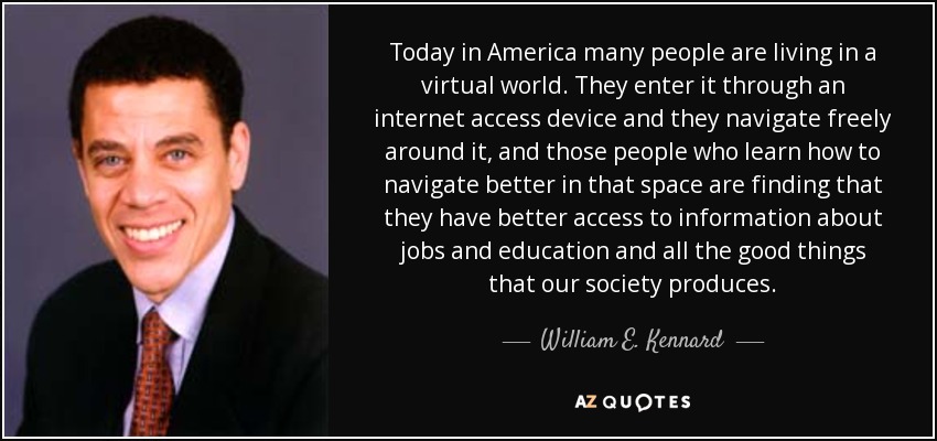 Today in America many people are living in a virtual world. They enter it through an internet access device and they navigate freely around it, and those people who learn how to navigate better in that space are finding that they have better access to information about jobs and education and all the good things that our society produces.