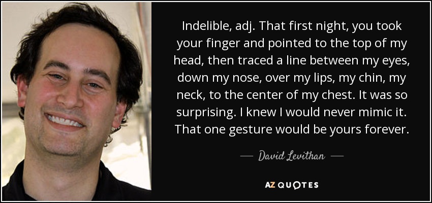 Indelible, adj. That first night, you took your finger and pointed to the top of my head, then traced a line between my eyes, down my nose, over my lips, my chin, my neck, to the center of my chest. It was so surprising. I knew I would never mimic it. That one gesture would be yours forever.