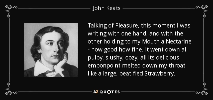 Talking of Pleasure, this moment I was writing with one hand, and with the other holding to my Mouth a Nectarine - how good how fine. It went down all pulpy, slushy, oozy, all its delicious embonpoint melted down my throat like a large, beatified Strawberry.