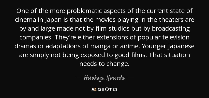 One of the more problematic aspects of the current state of cinema in Japan is that the movies playing in the theaters are by and large made not by film studios but by broadcasting companies. They're either extensions of popular television dramas or adaptations of manga or anime. Younger Japanese are simply not being exposed to good films. That situation needs to change.