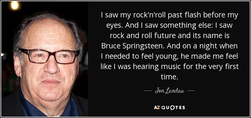 I saw my rock'n'roll past flash before my eyes. And I saw something else: I saw rock and roll future and its name is Bruce Springsteen. And on a night when I needed to feel young, he made me feel like I was hearing music for the very first time.
