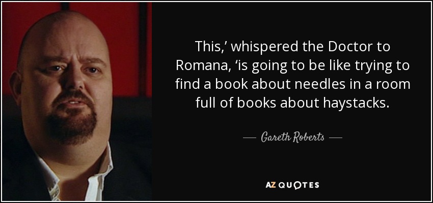 This,’ whispered the Doctor to Romana, ‘is going to be like trying to find a book about needles in a room full of books about haystacks.