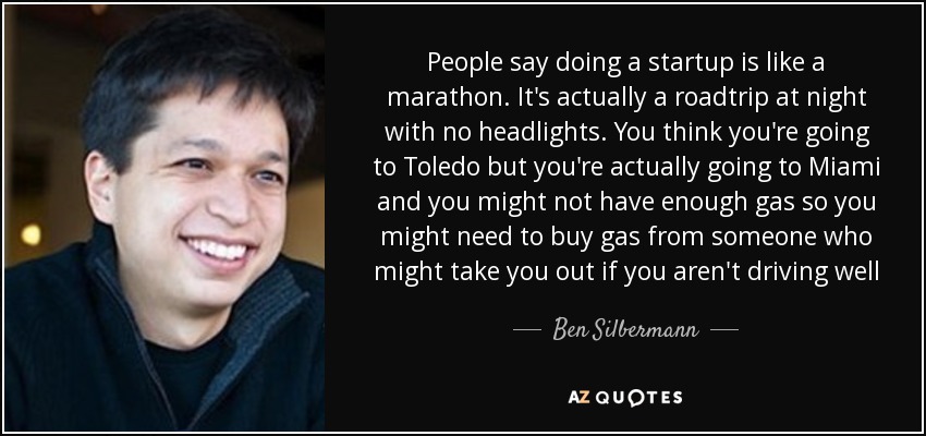 People say doing a startup is like a marathon. It's actually a roadtrip at night with no headlights. You think you're going to Toledo but you're actually going to Miami and you might not have enough gas so you might need to buy gas from someone who might take you out if you aren't driving well