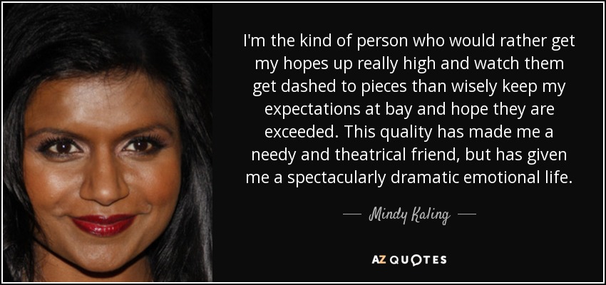I'm the kind of person who would rather get my hopes up really high and watch them get dashed to pieces than wisely keep my expectations at bay and hope they are exceeded. This quality has made me a needy and theatrical friend, but has given me a spectacularly dramatic emotional life.
