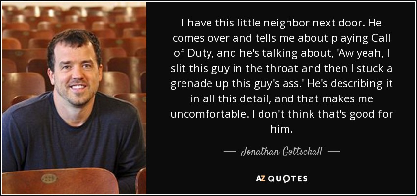 I have this little neighbor next door. He comes over and tells me about playing Call of Duty, and he's talking about, 'Aw yeah, I slit this guy in the throat and then I stuck a grenade up this guy's ass.' He's describing it in all this detail, and that makes me uncomfortable. I don't think that's good for him.