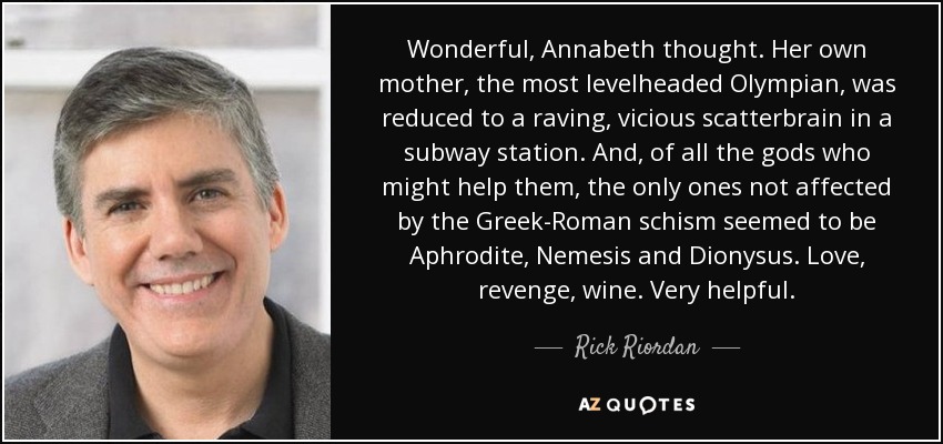 Wonderful, Annabeth thought. Her own mother, the most levelheaded Olympian, was reduced to a raving, vicious scatterbrain in a subway station. And, of all the gods who might help them, the only ones not affected by the Greek-Roman schism seemed to be Aphrodite, Nemesis and Dionysus. Love, revenge, wine. Very helpful.