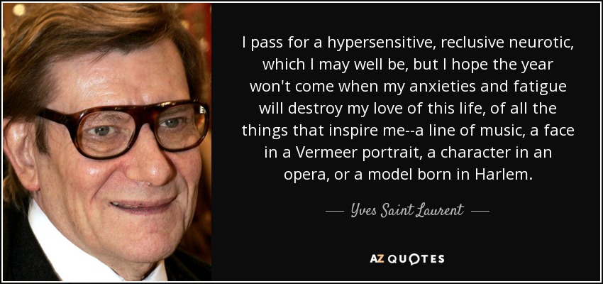 I pass for a hypersensitive, reclusive neurotic, which I may well be, but I hope the year won't come when my anxieties and fatigue will destroy my love of this life, of all the things that inspire me--a line of music, a face in a Vermeer portrait, a character in an opera, or a model born in Harlem.