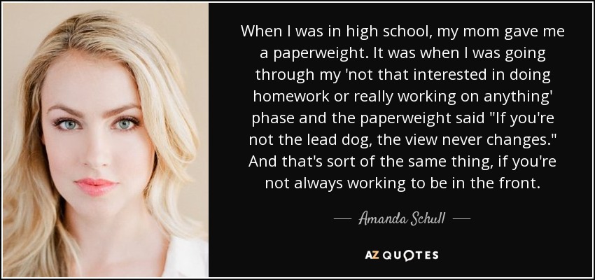 When I was in high school, my mom gave me a paperweight. It was when I was going through my 'not that interested in doing homework or really working on anything' phase and the paperweight said "If you're not the lead dog, the view never changes." And that's sort of the same thing, if you're not always working to be in the front.