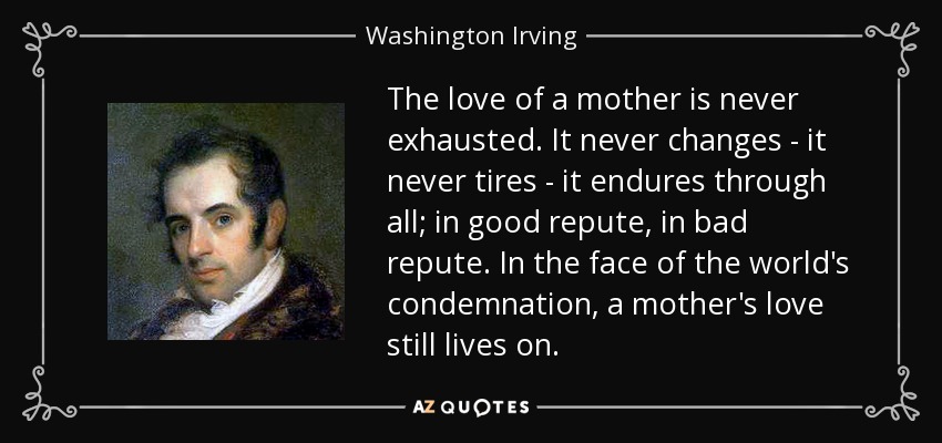 The love of a mother is never exhausted. It never changes - it never tires - it endures through all; in good repute, in bad repute. In the face of the world's condemnation, a mother's love still lives on.