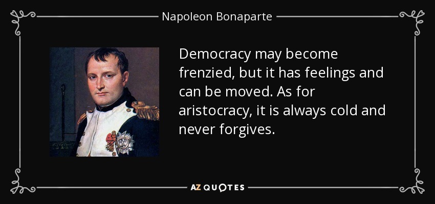 Democracy may become frenzied, but it has feelings and can be moved. As for aristocracy, it is always cold and never forgives.