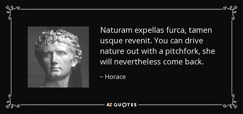 Naturam expellas furca, tamen usque revenit. You can drive nature out with a pitchfork, she will nevertheless come back.