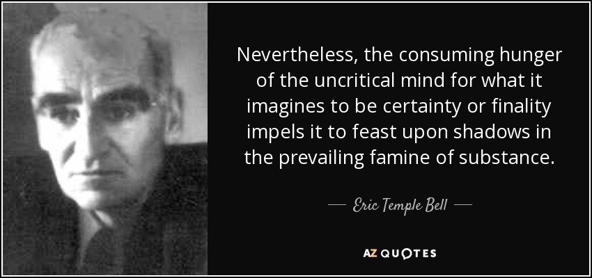 Nevertheless, the consuming hunger of the uncritical mind for what it imagines to be certainty or finality impels it to feast upon shadows in the prevailing famine of substance.