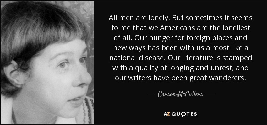 All men are lonely. But sometimes it seems to me that we Americans are the loneliest of all. Our hunger for foreign places and new ways has been with us almost like a national disease. Our literature is stamped with a quality of longing and unrest, and our writers have been great wanderers.