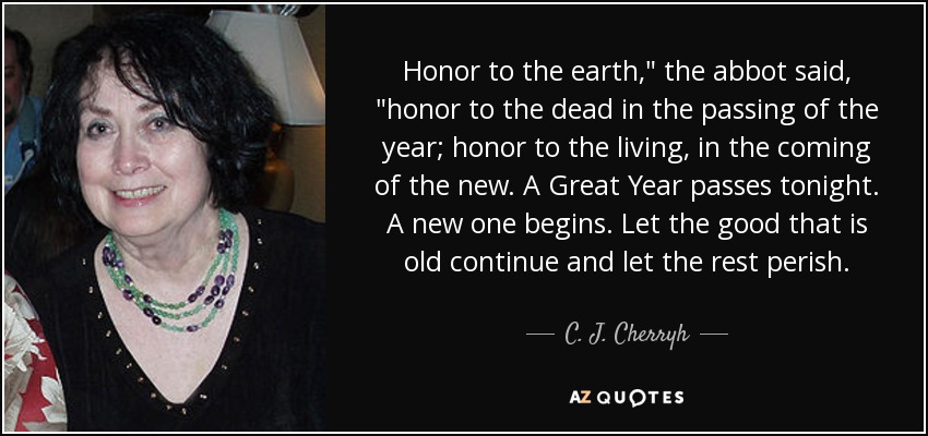 Honor to the earth," the abbot said, "honor to the dead in the passing of the year; honor to the living, in the coming of the new. A Great Year passes tonight. A new one begins. Let the good that is old continue and let the rest perish.