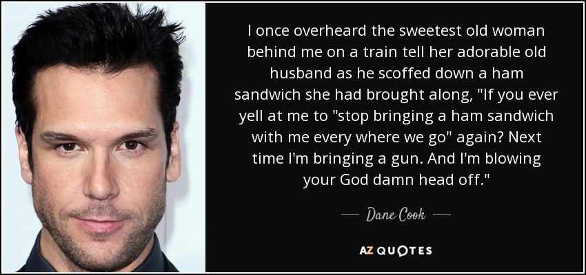 I once overheard the sweetest old woman behind me on a train tell her adorable old husband as he scoffed down a ham sandwich she had brought along, "If you ever yell at me to "stop bringing a ham sandwich with me every where we go" again? Next time I'm bringing a gun. And I'm blowing your God damn head off."