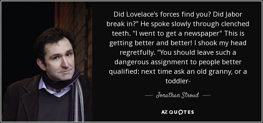 Did Lovelace's forces find you? Did Jabor break in?" He spoke slowly through clenched teeth. "I went to get a newspaper" This is getting better and better! I shook my head regretfully. "You should leave such a dangerous assignment to people better qualified: next time ask an old granny, or a toddler-