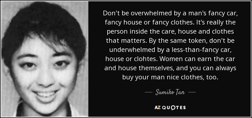 Don't be overwhelmed by a man's fancy car, fancy house or fancy clothes. It's really the person inside the care, house and clothes that matters. By the same token, don't be underwhelmed by a less-than-fancy car, house or clohtes. Women can earn the car and house themselves, and you can always buy your man nice clothes, too.