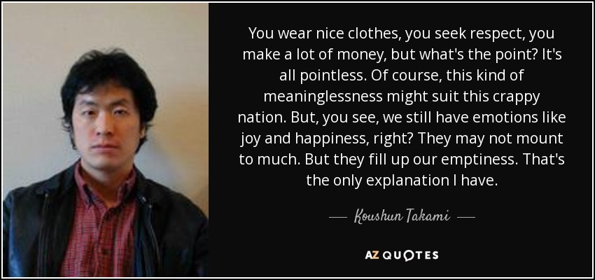 You wear nice clothes, you seek respect, you make a lot of money, but what's the point? It's all pointless. Of course, this kind of meaninglessness might suit this crappy nation. But, you see, we still have emotions like joy and happiness, right? They may not mount to much. But they fill up our emptiness. That's the only explanation I have.