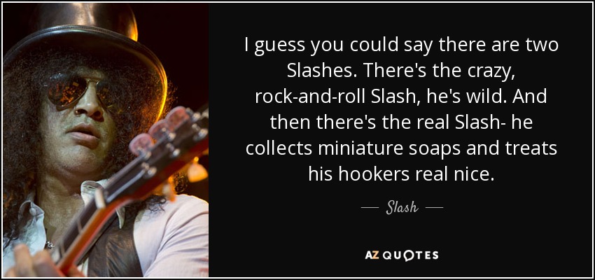 I guess you could say there are two Slashes. There's the crazy, rock-and-roll Slash, he's wild. And then there's the real Slash- he collects miniature soaps and treats his hookers real nice.