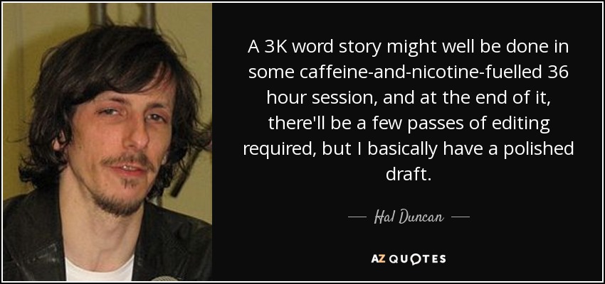 A 3K word story might well be done in some caffeine-and-nicotine-fuelled 36 hour session, and at the end of it, there'll be a few passes of editing required, but I basically have a polished draft.