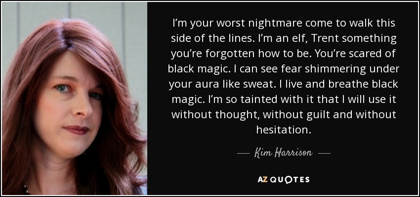 I’m your worst nightmare come to walk this side of the lines. I’m an elf, Trent something you’re forgotten how to be. You’re scared of black magic. I can see fear shimmering under your aura like sweat. I live and breathe black magic. I’m so tainted with it that I will use it without thought, without guilt and without hesitation.