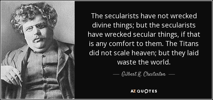 The secularists have not wrecked divine things; but the secularists have wrecked secular things, if that is any comfort to them. The Titans did not scale heaven; but they laid waste the world.