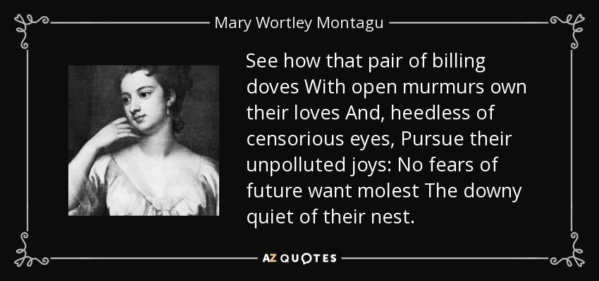 See how that pair of billing doves With open murmurs own their loves And, heedless of censorious eyes, Pursue their unpolluted joys: No fears of future want molest The downy quiet of their nest.
