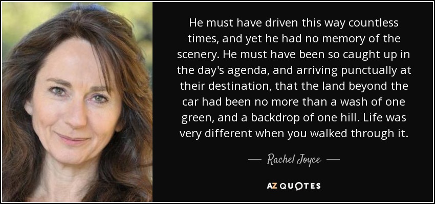 He must have driven this way countless times, and yet he had no memory of the scenery. He must have been so caught up in the day's agenda, and arriving punctually at their destination, that the land beyond the car had been no more than a wash of one green, and a backdrop of one hill. Life was very different when you walked through it.